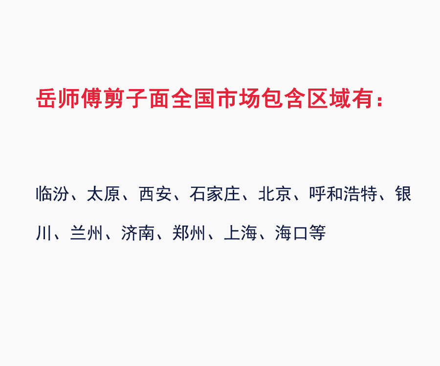 岳師傅剪子面幾十年來立足山西市場,不斷開拓省內外市場,以極具知名度的品牌形象,以眾人點贊的產品口味贏得了廣大消費者的喜愛,目前全國190多家店...